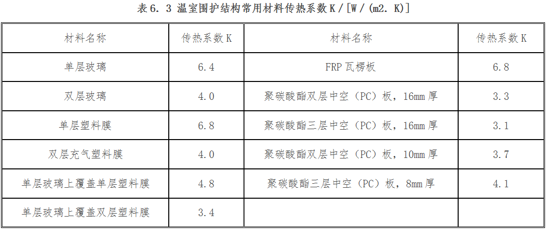 對于單一材料的圍護結(jié)構(gòu),材料的傳熱系數(shù)K可直接從有關(guān)手冊查取。表6.3列出了溫室圍護常用透光覆蓋材料傳熱系數(shù)。對特殊溫室透光覆蓋材料,應(yīng)咨詢生產(chǎn)廠家。