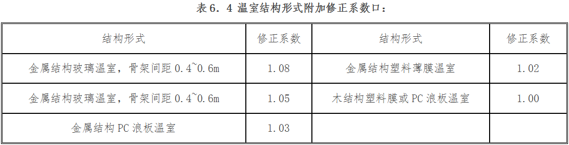 (1)結(jié)構(gòu)形式修正(α1) 溫室透光覆蓋材料必須有相應(yīng)的結(jié)構(gòu)支撐。目前支撐結(jié)構(gòu)的材料多為金屬,主要為鋁合金。相比透光覆蓋材料,鑲嵌這些覆蓋材料的金屬材料其傳熱速度和傳熱量都高,而且鑲嵌覆蓋材料所用的鋁合金條越多,附加傳熱量就越大。此外,溫室的天溝、屋脊、窗框和骨架等都是增大傳熱量的因素。工程計算中,統(tǒng)一考慮上述因素,采用結(jié)構(gòu)形式附加傳熱量進行修正,不同溫室結(jié)構(gòu)形式的附加修正系數(shù)見表6.4。