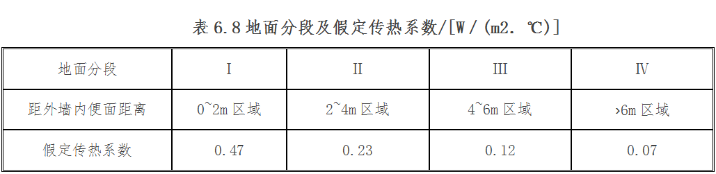 鑒于外界氣溫對地面各段傳熱影響不同,地面?zhèn)鳠嵯禂?shù)也隨之各異,靠近外墻的地面,由于熱流經(jīng)過的路程較短,熱阻小,傳熱系數(shù)就大,而距外墻較遠的地方傳熱系數(shù)就小。根據(jù)實驗知道,在距外墻6m以內(nèi)的地面,其傳熱量與距外墻的距離有較顯著的關(guān)系,6m以外則幾乎與距離無關(guān)。因此,在工程中一般采用近似計算,將距外墻8m以內(nèi)的地段分為每2m寬為一地帶,如圖6.1。在地面無保溫層的條件下,各帶的傳熱系數(shù)如表6.8。