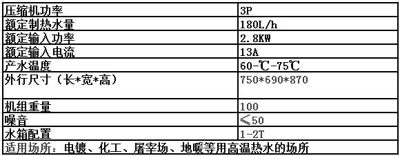 1、 以上數(shù)據(jù)是在干球24℃,溫球溫度19℃,進水溫度27℃,出水溫度75℃的環(huán)境條件下測的;