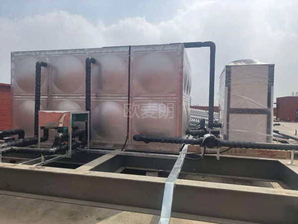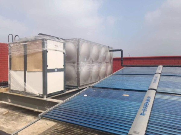 項目配置:36組太陽能真空管集熱器+1臺歐麥朗空氣能熱泵熱水機組+1個方形保溫水箱
