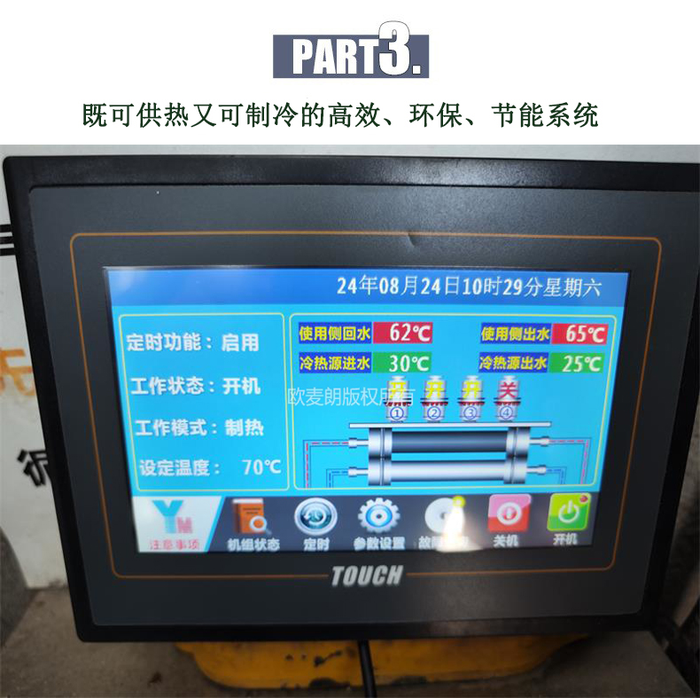 簡介:歐麥朗為其定制的水源熱泵機組以制熱為主,設定溫度為 70 度。這一高溫熱水在模具塑型過程中發(fā)揮著關鍵作用,能夠為模具提供足夠的熱量,使其達到理想的塑型狀態(tài)。同時,30 度的冷卻水通過水源熱泵機組換熱降至 25 度以下,為模具的冷卻定型創(chuàng)造了適宜的條件。這種精確的溫度控制,確保了模具在不同生產階段的質量和穩(wěn)定性。