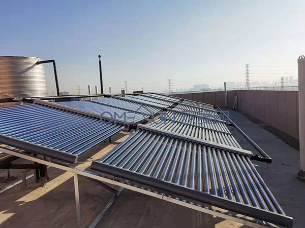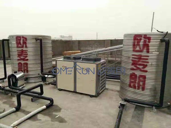設(shè)備配置:一臺(tái)空氣源熱泵+多組太陽(yáng)能集熱器+集熱水箱+保溫水箱