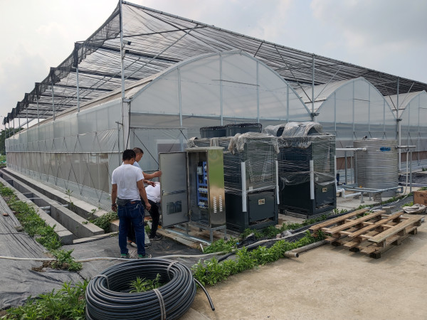 現(xiàn)在為完善園區(qū)智慧農(nóng)業(yè)設(shè)備與歐麥朗合作,采購(gòu)歐麥朗智能風(fēng)冷冷(熱)泵機(jī)組,為園區(qū)內(nèi)一千兩百平草莓大棚提供恒溫,草莓適宜的環(huán)境溫度為冬季20度,夏季26度。所以該溫室大棚冬季和夏季需要不同的恒溫模式,來(lái)使溫室內(nèi)草莓一年四季都出在最適宜生長(zhǎng)溫度下。本次采用兩臺(tái)25P風(fēng)冷冷(熱)泵機(jī)組,同時(shí)在大棚內(nèi)配備有24臺(tái)風(fēng)機(jī)盤管,用以保障大棚內(nèi)溫度均衡穩(wěn)定。