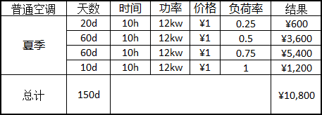 普通空調(diào)系統(tǒng)夏季制冷時(shí),機(jī)組總功率為12KW。 (機(jī)組功率根據(jù)負(fù)荷及機(jī)組能效比確定)