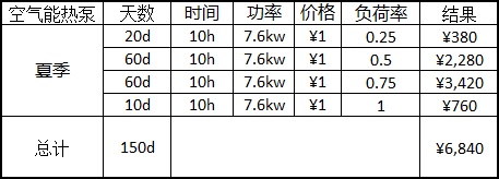 降溫除濕熱回收空氣源熱泵系統(tǒng)夏季制冷時(shí),機(jī)組及水泵的總功率為7.6KW (機(jī)組功率根據(jù)負(fù)荷及機(jī)組能效比確定)