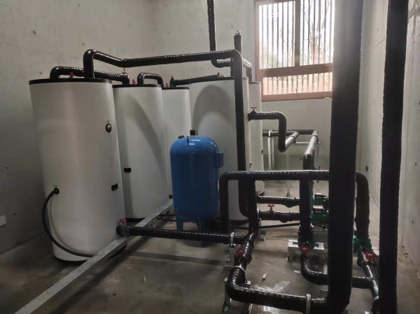 系統(tǒng)配置:采用一臺(tái)空氣源機(jī)組,一個(gè)455L電加熱水箱、4個(gè)455L儲(chǔ)水箱配置而成。整個(gè)系統(tǒng)承壓出水,系統(tǒng)穩(wěn)定性高。