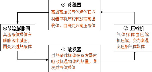 ①過(guò)熱液體媒體在蒸發(fā)器內(nèi)吸收低溫物體的熱量,蒸發(fā)成氣體媒體。