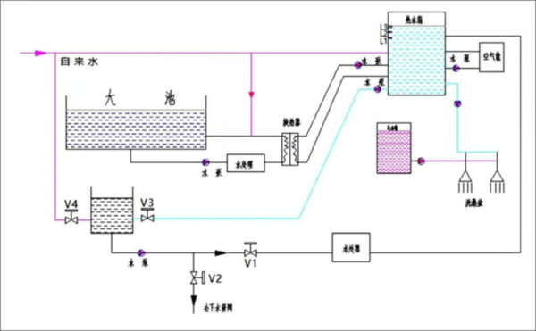 5.消耗熱水大的是游泳的小池。小池游泳的溫度是38℃,游泳的時(shí)間為15分鐘,在30℃的室內(nèi)環(huán)境中,能量損失是很小的。經(jīng)實(shí)測(cè)發(fā)現(xiàn),小池游完后水溫在35~36℃?;厥招〕?zé)崴疅崃渴窍到y(tǒng)能否在冬季滿足需求的關(guān)鍵。將小池的排水管路接上水泵、電動(dòng)閥V1和V2以及水處理設(shè)備。