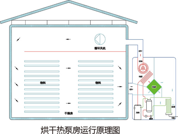 該機組運用逆卡諾原理的同時,并結合高效熱回收技術,在整個烘干除濕過程中,通過回風管將烘房內(nèi)的濕空氣接入主機,利用顯熱板式熱回收器回收濕熱空氣的顯熱和潛熱,進行熱回收再利用,大大提高了主機的性能,提高了烘干速度以及物料品質(zhì)。不僅可以利用余熱提高機組本身的性能,還能減少對環(huán)境的熱污染,緩解城市的熱島效應。