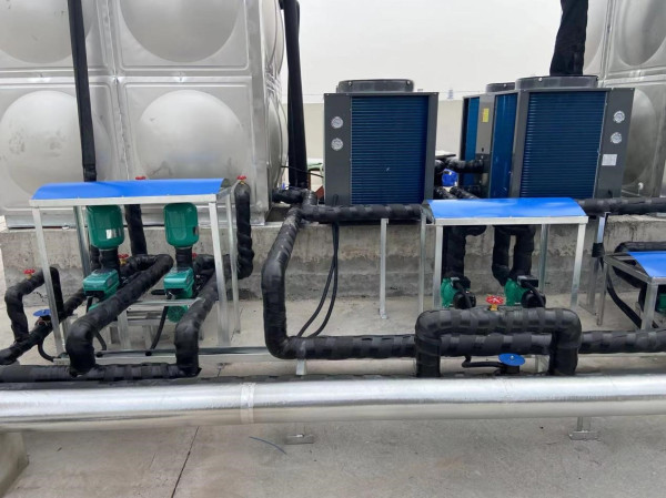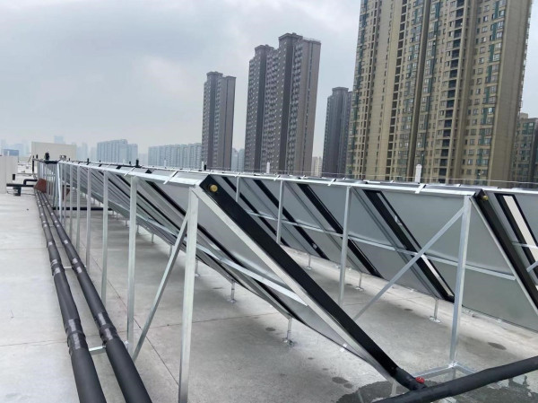 項(xiàng)目配置:8噸集熱水箱和8噸恒溫水箱,81組平板集熱太陽(yáng)能+2臺(tái)10P空氣能熱泵