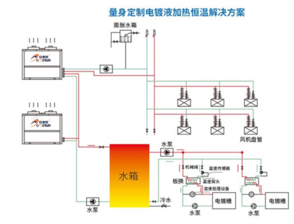 通過熱泵主機(jī)加熱儲熱水箱的熱水,再把熱水通過板換與槽液進(jìn)行換熱,由溫度傳感器控制水管恒溫閥的開關(guān)。
