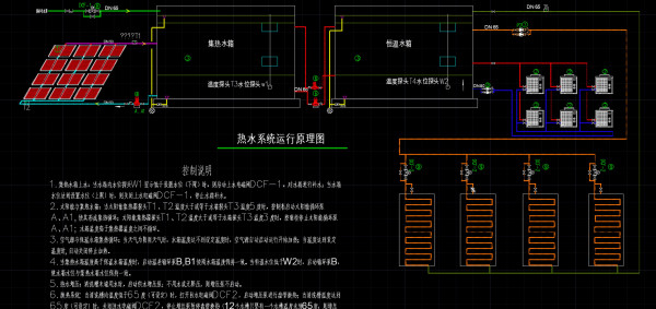 2.太陽(yáng)能與集熱水箱:當(dāng)太陽(yáng)能集熱器探頭T1、T2溫度大于或等于水箱探頭T3溫度5度時(shí),控制柜啟動(dòng)太陽(yáng)能循環(huán)泵A、A1,使其形成集熱循環(huán);太陽(yáng)能集熱器探頭T1、T2溫度大于或等于水箱探頭T3溫度3度時(shí),控制柜停止太陽(yáng)能循環(huán)泵A、A1;水箱溫度高于集熱器溫度之間不循環(huán)。