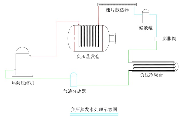 負(fù)壓蒸發(fā)首先將負(fù)壓倉(cāng)內(nèi)的廢水加熱至40度左右,開啟真空泵將真空倉(cāng)內(nèi)的壓力降至-90Kpa左右,廢水沸騰后水蒸氣進(jìn)入殼管換熱器進(jìn)行冷凝,變成冷凝水。當(dāng)熱量溢出時(shí),四通閥自動(dòng)切換,改為蒸發(fā)器散熱,以保證機(jī)組的正常工作。真空倉(cāng)的廢水在水蒸氣蒸發(fā)后結(jié)晶成固廢,盡可能的減少?gòu)U水對(duì)環(huán)境的破壞。固廢可以用于焚燒發(fā)電或者掩埋處理。