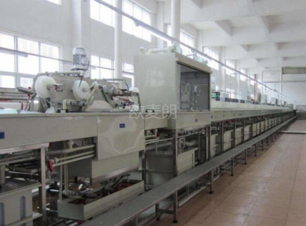 連續(xù)電鍍又稱卷對(duì)卷電鍍,素材一般是帶狀可以卷起來的,如鋼帶,連續(xù)沖壓后的產(chǎn)品。電鍍流程由放料→前處理→電鍍→后處理→烘干→收料組成。每個(gè)電鍍槽一般分為母槽和子槽,藥水從母槽中用泵打入子槽中,子槽兩邊有縫隙,要鍍的料從縫隙中穿過,打入子槽的藥水也從縫隙中流出而流入母槽,由于流入流出的速度有差異,就可以保持一定的液位。溫度要求一般在55-60℃。