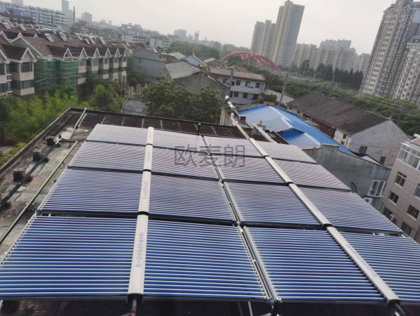 靖江醫(yī)保職工康復(fù)醫(yī)院熱水系統(tǒng)改造方案:將原來(lái)的太陽(yáng)能整體拆除,管道采用原先設(shè)計(jì)管道,增加集中太陽(yáng)能進(jìn)行供熱,空氣能進(jìn)行輔助。采用8組50管太陽(yáng)能集熱器+兩臺(tái)歐麥朗空氣能熱泵熱水機(jī)組!