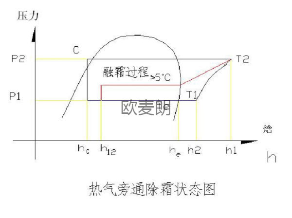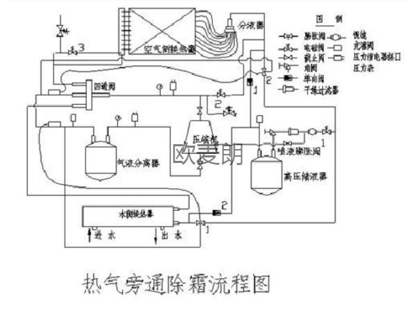當(dāng)進(jìn)入除霜程序時,機(jī)組仍保持制熱工作循環(huán),在壓縮機(jī)的排氣側(cè)分出一股高溫氣體進(jìn)入需要除霜的空氣側(cè)換熱器,使高溫氣體在高于 5℃發(fā)生相變放出潛熱達(dá)到除霜目的(見以上熱氣旁通除霜狀態(tài)圖)。除霜后的制冷劑液體進(jìn)入另外一側(cè)正常制熱的換熱器繼續(xù)蒸發(fā),這樣,這部分制冷劑仍發(fā)揮了制熱的功效,蒸發(fā)后變?yōu)闅怏w避免了壓縮機(jī)因除霜造成的回液可能。若因某種原因造成除霜不停止時,高溫氣體不直接回到壓縮機(jī),而是進(jìn)入另外一側(cè)正常制熱的換熱器,此時制熱膨脹閥將會根據(jù)過熱度的變化自動增加供液量,從而使壓縮機(jī)的吸氣保持在合適的過熱度范圍內(nèi)。在整個除霜過程中,由于避免了機(jī)組制冷循環(huán)和制熱循環(huán)的相互轉(zhuǎn)換,壓縮機(jī)的吸、排氣狀態(tài)基本保持穩(wěn)定。以上就是歐麥朗熱氣旁通除霜技術(shù)。