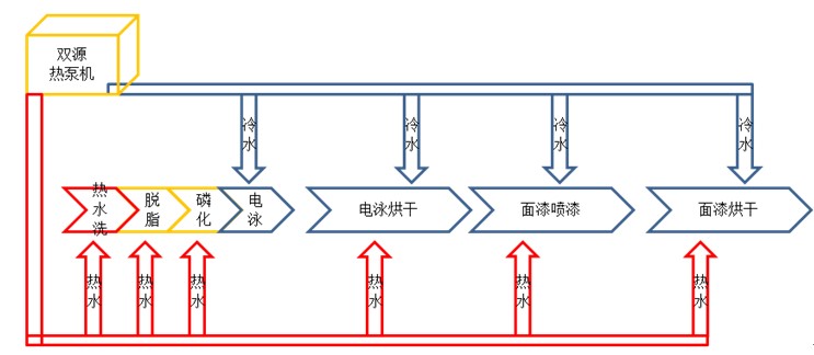 汽車生產(chǎn)制造過程包含沖壓、焊接、涂裝和總裝四個工藝過程,其中涂裝之前,先要進行表面處理,主要目的是清除車身表面的油污、塵土、銹蝕等。完整的表面處理工藝是:預(yù)脫脂→脫脂→熱水洗→冷水洗→酸洗→冷水洗→磷化→冷水洗→表面調(diào)整→電泳→冷水洗→熱水洗→純水洗→干燥。至今工序中常規(guī)加熱、冷卻能源幾乎都是燃氣直接加熱蒸汽(高壓熱水、溫水)和冷凍機冷水。各需求之間獨立處理,沒有做能源回收再利用的整合處理,造成能源浪費,單產(chǎn)能耗高等問題。