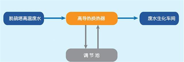脫硫廢水余熱回收項(xiàng)目在調(diào)節(jié)池排水管道上設(shè)置換熱系統(tǒng),處理廢水量為350~450t/h,回收熱量節(jié)省蒸汽,帶來年收益≥500萬元/年。