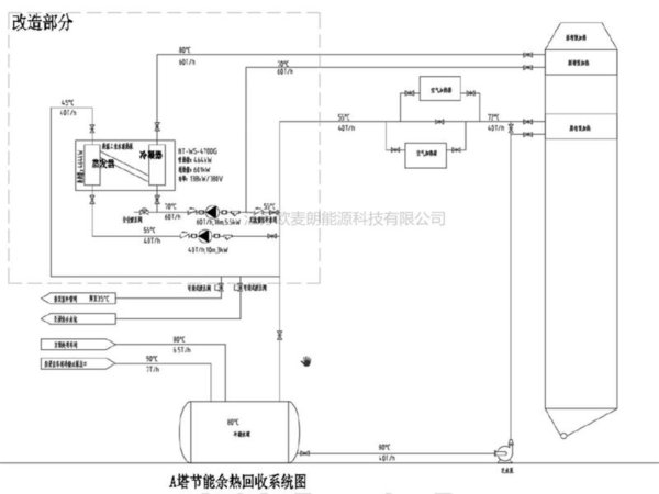 調(diào)質(zhì)塔 A 采用冷凝水的熱量進(jìn)行加熱,現(xiàn)在形式為冷凝水進(jìn)行水箱后,又水箱內(nèi)的水循環(huán)至末端進(jìn)行換熱,多余的水進(jìn)行外排,目前排水溫度為 80℃,擬對(duì)換熱后的水進(jìn)行二次熱回收,回收后的余熱進(jìn)行二次利用,降低外排溫度。