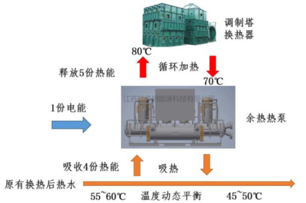 本項(xiàng)目采用采用電力作為驅(qū)動(dòng)動(dòng)力,針對(duì)調(diào)制塔換熱后的熱水進(jìn)行二次熱回收,系統(tǒng)原理下: